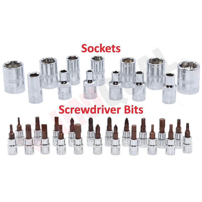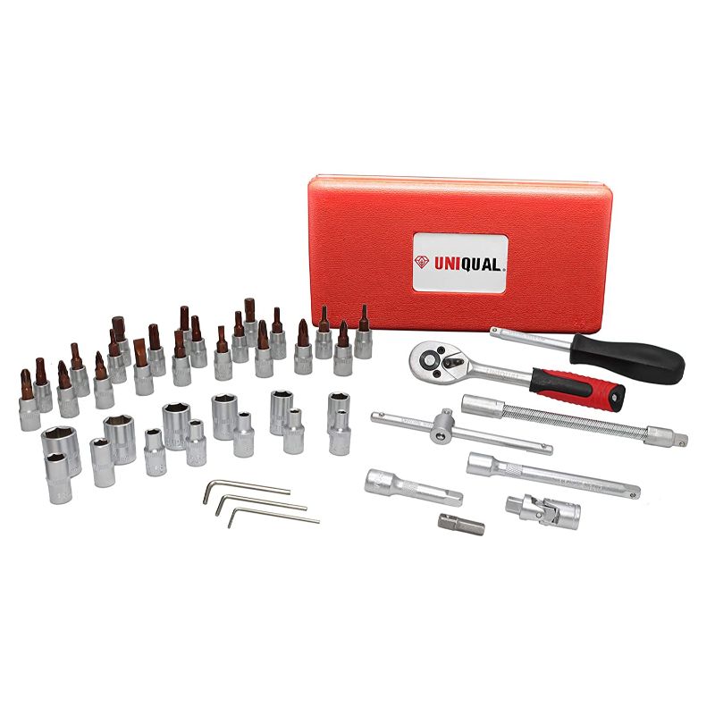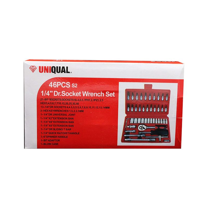 - UniQual 46pcs 1/4″ Combination Drive Socket Set And Wrench Set Tool Contains All The Tools Needed For Home DIY Work Or Bolt/Screw Removal In A Mechanics Workshop