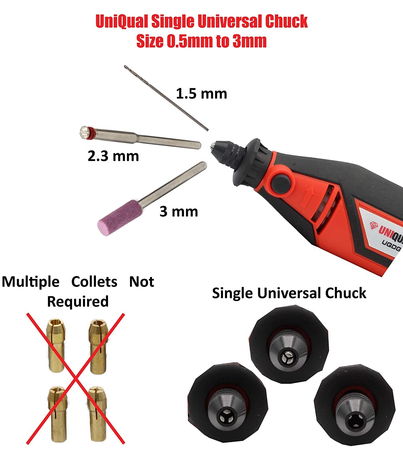 - QUICK CHANGE DRILL CHUCK: Comes with a Universal Keyless Chuck to quickly change accessories without the hassle of changing collets. Three Jaws Universal Chuck gives better stability on your projects. UniQual Universal Chuck accepts accessories from 0.4mm to 3.2mm, wider compatible than others. An Ideal tool when job requires frequent accessory changes.