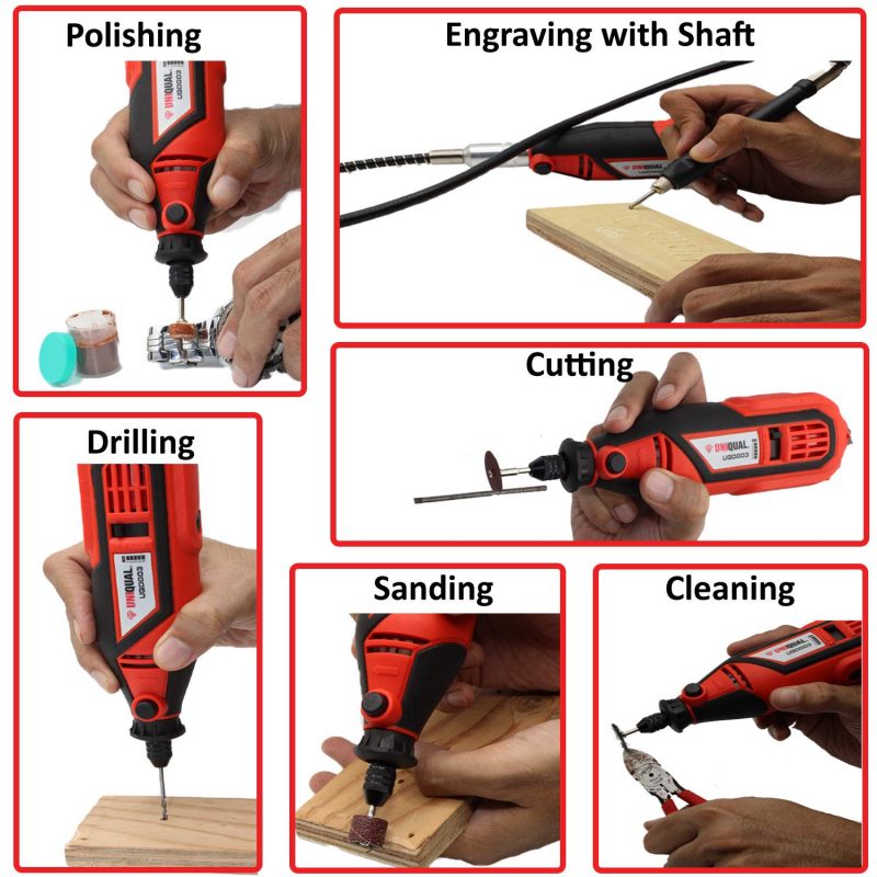 - ERGONOMIC & VARIABLE SPEED: Light Weight and Soft Grip enables comfortable opeartion of rotary tool for longer working hours. SIX Speed range from 8,000 to 30,000 RPM gives better control over tasks from delicate engraving on glass to high speed cutting of hardened steel. Work on different speeds with different accessories on different surface for precise and intricate projects. It works on 220V and has 2 Pin Electric Plug.