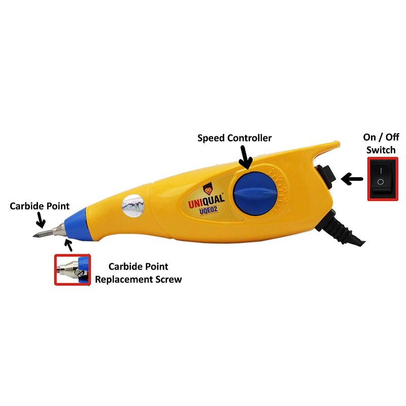 • USER FRIENDLY: UniQual Deluxe Engraver is light weight as compared to other engravers and easy to use. Its Sleek Body provides comfortable grip over engraver for better control of engraving operation on variety of materials. It works on 220-240V and has 2 pin plug.